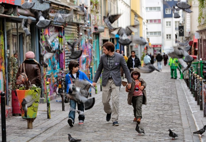 ‘Benjamin Malaussène (Raphaël Personnaz) et ses frères Jérémy (Adrien Ferran) et Le Petit (Mathis Bour) dans leur quartier de Belleville’