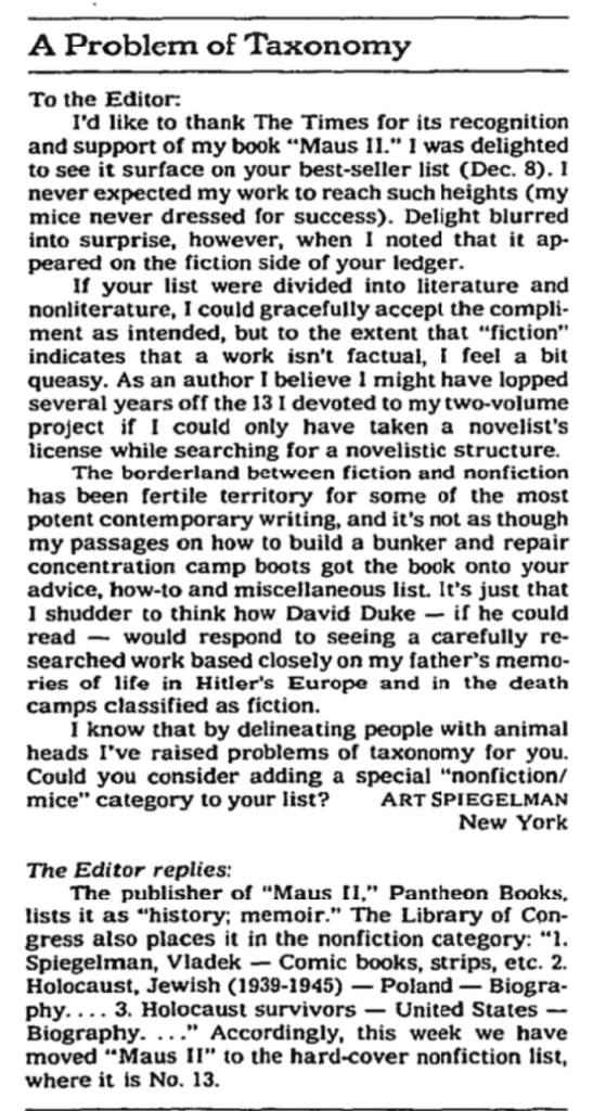 Si todavía no habéis visto la novena viñeta, os invito a leer este fantástico hilo de Twitter que Corrales dedica a ‘Maus‘. Ahí he encontrado la carta que Art Spiegelman envío a los editores de ‘The New York Times‘ pidiendo que ‘Maus‘ pasase de la categoría de libros de Ficción a los de No ficción.