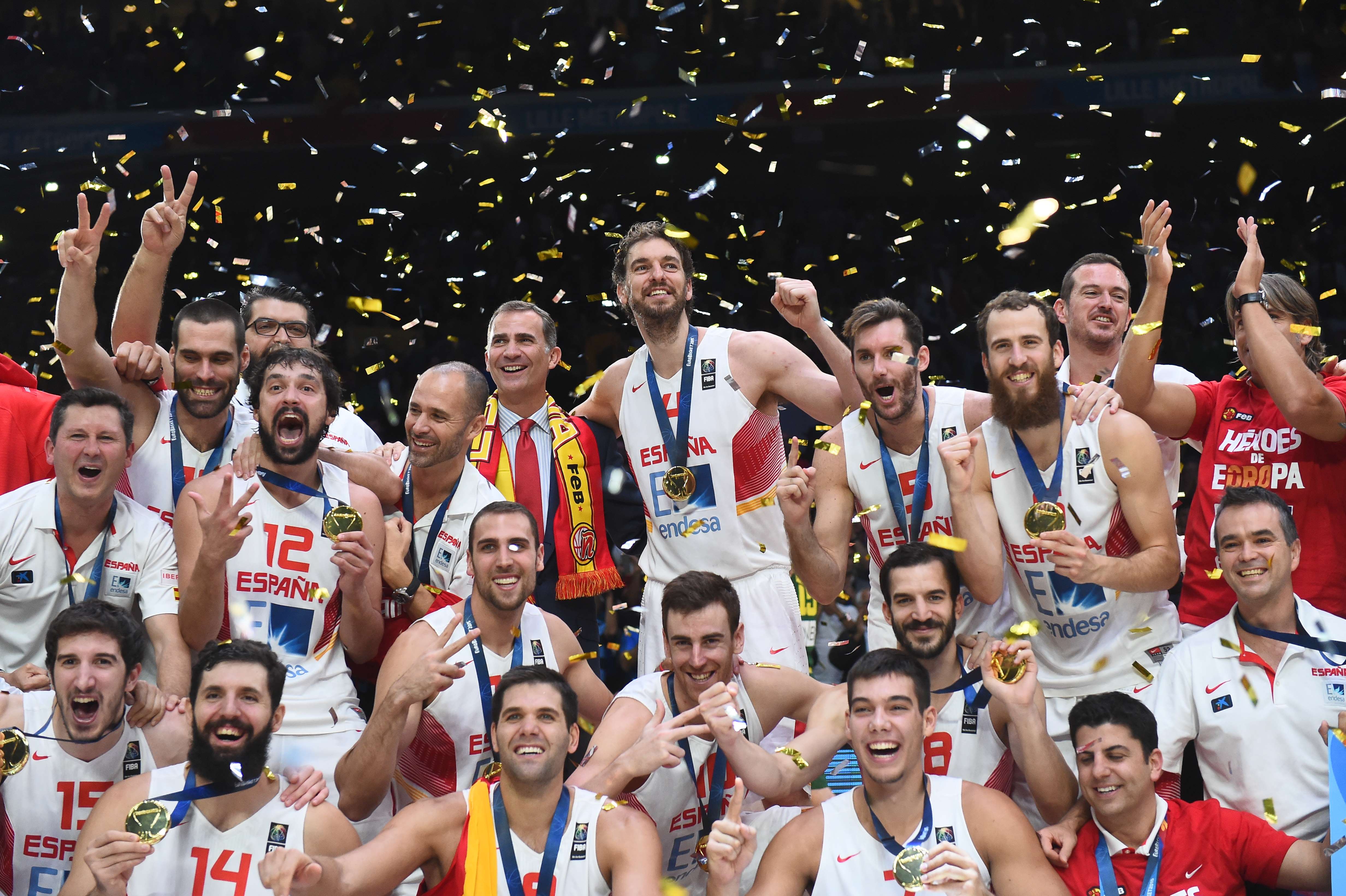 Spain’s center Pau Gasol (Rear C) and his teammates celebrate after Spain won the final basketball match between Spain and Lithuania at the EuroBasket 2015 in Lille, northern France, on September 20, 2015. AFP PHOTO / EMMANUEL DUNAND